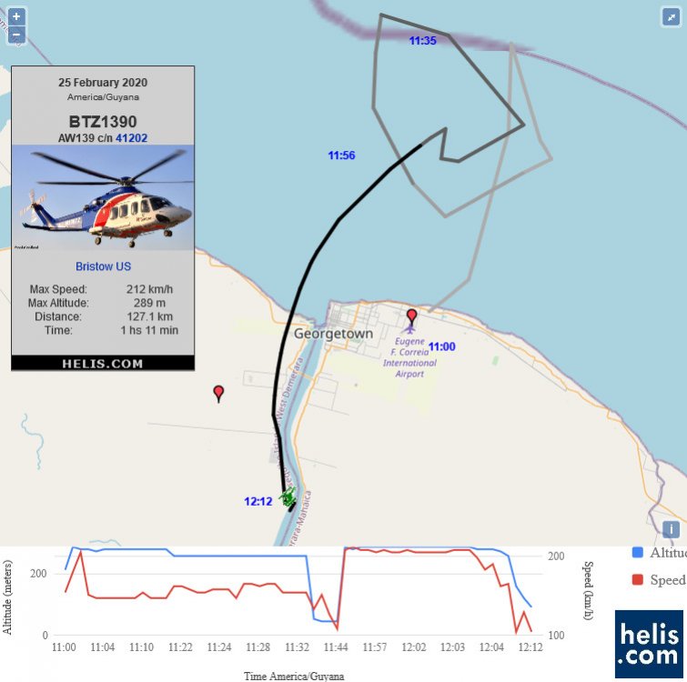 | | 2013-04-27 | | A 2LS0 - Galliano, Louisiana | | 2015-03-31 | | B KGAO - Galliano, Louisiana | | 2016-01-07 | | C KPNS - Pensacola, Florida | | | D KPBI - West Palm Beach, Florida | | 2016-01-08 | | E MBPV - Providenciales, Caicos Island | | 2016-01-09 | | F TNCM - Philipsburg, St. Maarten | | 2018-02 | | G SYEC | Ogle, Demerara-Mahaica Bristow AW139 Five More Years in Guyana | | 2020-02 | | G SYEC | Ogle, Demerara-Mahaica | | 2020-02-25 | BTZ1390 | Ogle, Demerara-Mahaica  | tracking