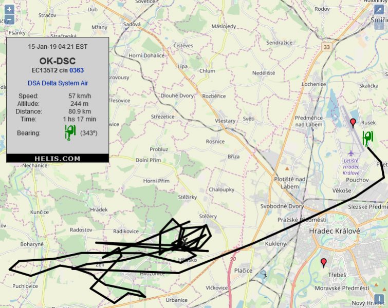 Detailed history and photos of helicopter Eurocopter EC135T2 Serial 0363 Register OK-DSC used by DSA Delta System Air Track service timeline and current status. OK-DSC 2004-10 Delta System-Air from Oct04, test serial D-HECF 2006-05-27 A LKHK - Hradec Králové, Hradec Králové 2007-04-23 B LKLB - Liberec, Liberec 2007-05-19 A LKHK - Hradec Králové, Hradec Králové 2011-07-01 B LKLB - Liberec, Liberec 2013-08-17 B LKLB - Liberec, Liberec 2015-05-15 A LKHK - Hradec Králové, Hradec Králové 2018-04-15 B LKLB - Liberec, Liberec 2019-01-14 Hradec Králové, Hradec Králové2019-01-15 Hradec Králové, Hradec Královétracking 2020-12-27 K18 Liberec, Liberec2025-06-24 KR18 Prague, Prague2025-11-04 KR18 Liberec, Liberec2025-12-04 Mnichovo Hradiste, Central Bohemia2026-01-03 KR18 Liberec, Liberec2026-02-02 KR18 Turnov, Liberec2026-03-04 KR18 Liberec, Liberec2026-03-13 KR18 Havlickuv Brod, Vysočina