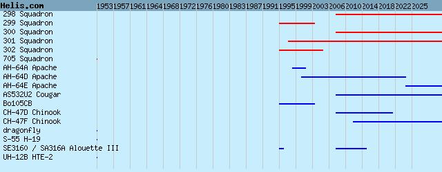 | 1995/05 | 302 Squadron | AH-64D Apache, SE3160 / SA316A Alouette III, |