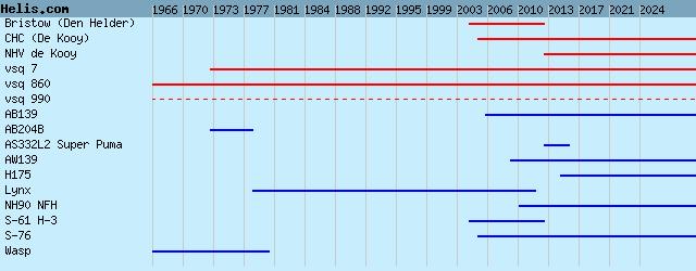| 2013- | NHV de Kooy | H175, AS332L2 Super Puma, | | 2005- | CHC (De Kooy) | AW139, AB139, S-76, | | 2004/13 | Bristow (Den Helder) | S-61 H-3, | | 1973- | vsq 7 | NH90 NFH, Lynx, AB204B, | | 1966- | vsq 860 | NH90 NFH, Lynx, Wasp, | | vsq 990 | |