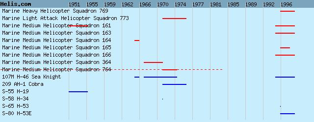 | 1996/98 | HMM-165 | 107M H-46 Sea Knight, | | 1996/99 | HMH-769 | S-80 H-53E, S-65 H-53, | | 1995/99 | HMM-161 | 107M H-46 Sea Knight, | | 1995/99 | HMM-163 | 107M H-46 Sea Knight, | | 1995/99 | HMM-166 | 107M H-46 Sea Knight, | | 1984/?? | HMM-764 | 107M H-46 Sea Knight, | | 1971/74 | HMM-764 | 107M H-46 Sea Knight, S-58 H-34, | | 1971/76 | HMLA-773 | 209 AH-1 Cobra, | | 1967/71 | HMM-364 | 107M H-46 Sea Knight, | | 1965/66 | HMM-164 | 107M H-46 Sea Knight, | | 1951/55 | HMM-161 | S-55 H-19, |