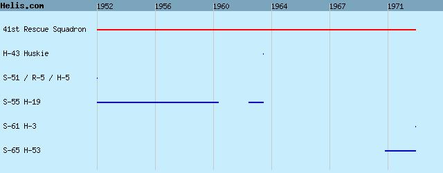 | 1952/73 | 41st RQS | S-61 H-3, S-65 H-53, H-43 Huskie, S-55 H-19, S-55 H-19, S-51 / R-5 / H-5, |