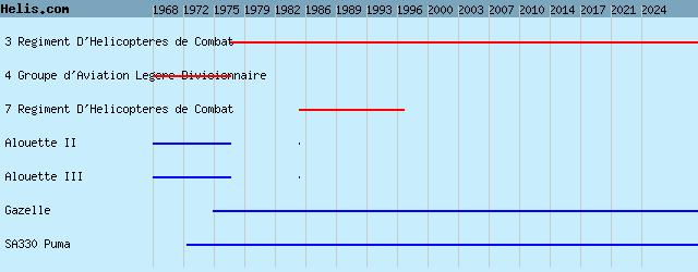 | 1985/97 | 7 RHC | SA330 Puma, Alouette III, Gazelle, Alouette II, | | 1977- | 3 RHC | Gazelle, SA330 Puma, | | 1968/77 | GALDIV 4 | Gazelle, SA330 Puma, Alouette II, Alouette III, |