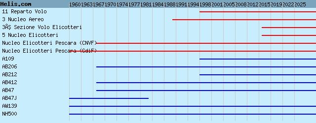 | 1960- | Nucleo Elicotteri Pescara (GdiF) | A109, NH500, AB47J, NH500, AW139, |