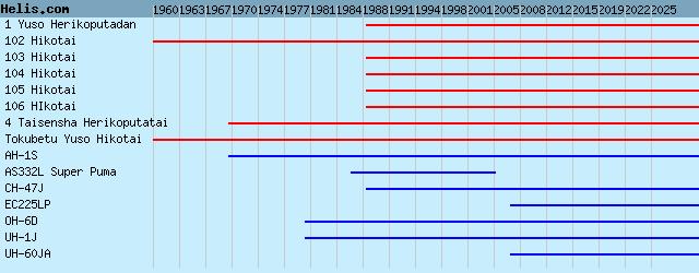 | 1988- | 1 Yuso Herikoputadan | | | 1988- | 103 Hikotai | CH-47J, | | 1988- | 104 Hikotai | CH-47J, | | 1988- | 105 Hikotai | CH-47J, | | 1988- | 106 HIkotai | CH-47J, | | 1970- | 4 Taisensha Herikoputatai | AH-1S, | | 1960- | Tokubetu Yuso Hikotai | EC225LP, AS332L Super Puma, | | 1960- | 102 Hikotai | UH-60JA, UH-1J, OH-6D, |