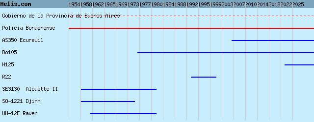 | 1954- | Policia Bonaerense | H125, AS350 Ecureuil, R22, Bo105, UH-12E Raven, SE3130 Alouette II, SO-1221 Djinn, | | Gobierno de la Provincia de Buenos Aires | EC145, EC135, Bk117, Bo105, |