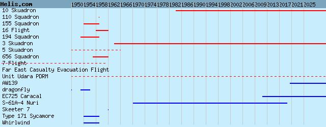 | 1984- | 10 Skuadron | EC725 Caracal, | | 1964- | 3.Skn | AW139, S-61A-4 Nuri, | | 1961/?? | 7 Flt | | | 1959 | 110 Squadron | Whirlwind, | | 1958/62 | 16 Flt | Skeeter 7, | | 1957/62 | 656 Squadron | | | 1954/59 | 155 Squadron | Whirlwind, Whirlwind, | | 1953/59 | 194 Squadron | Type 171 Sycamore, dragonfly, | | 1950 | Far East Casualty Evacuation Flight | dragonfly, | | ??/66 | 5 Skuadron | Alouette III, | | Unit Udara PDRM | |